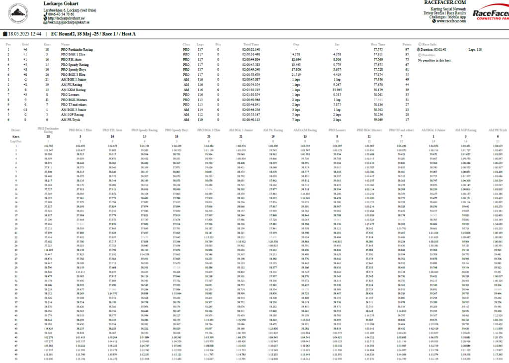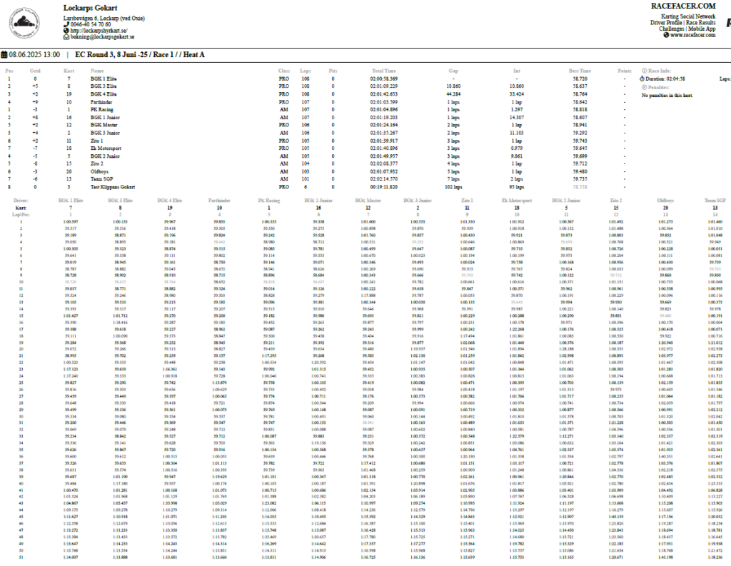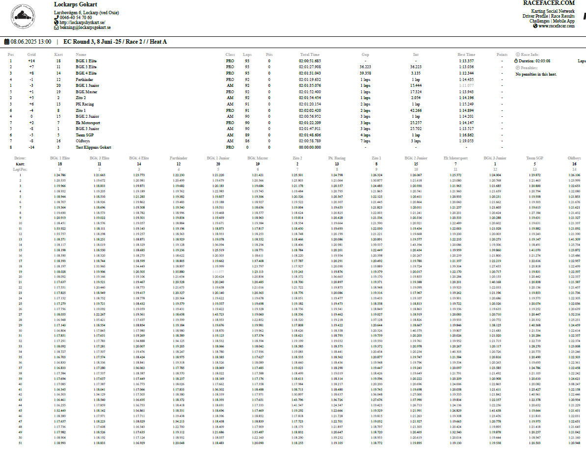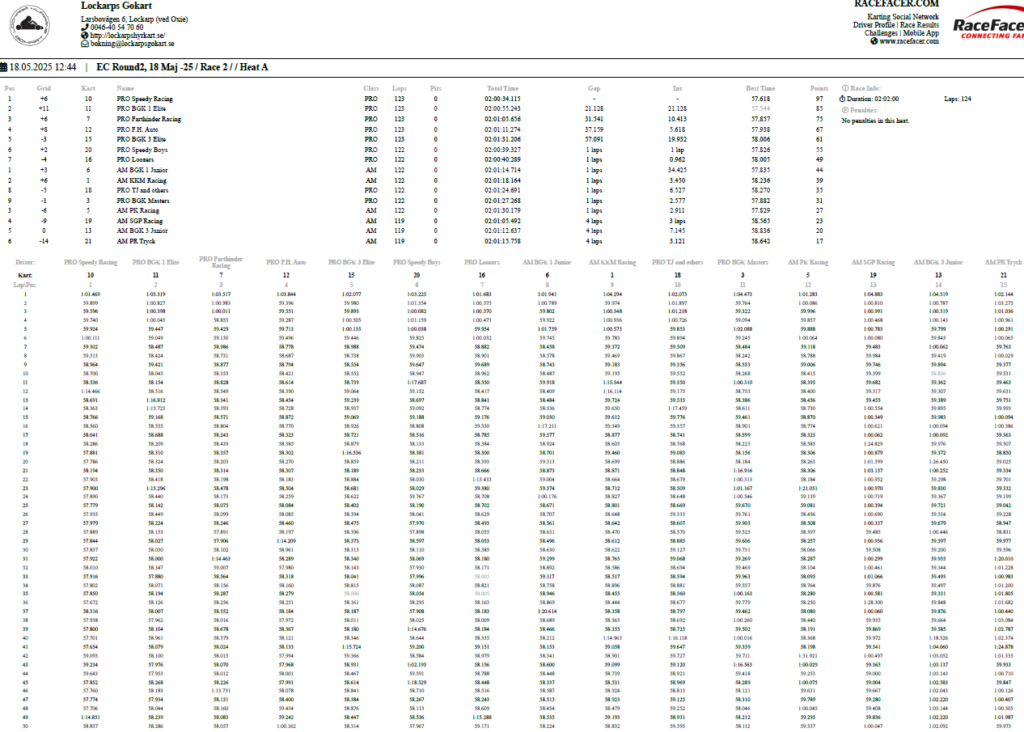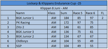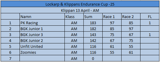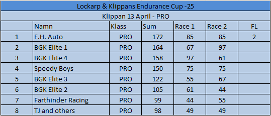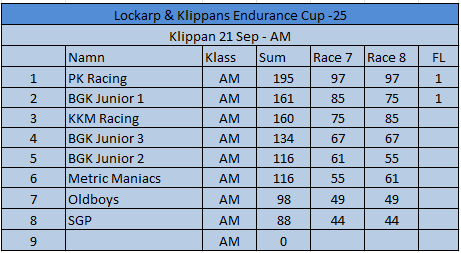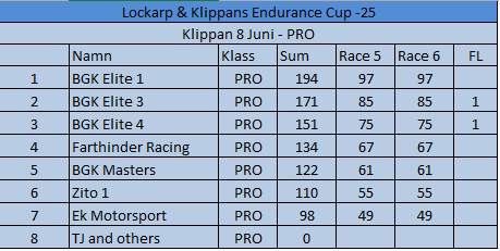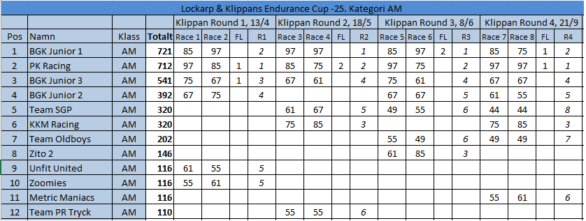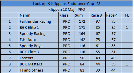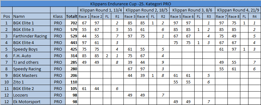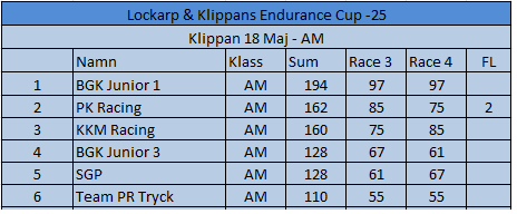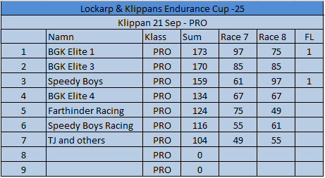 Resultat Endurance Cup -25 Resultat efter fyra deltävlingar. Resultat Round 4, Klippan 21 Sep -25 PRO1 – BGK Elite 12 – BGK Elite 33 – Speedy Boys4 – BGK Elite 45 – Farthinder Racing6 – Speedy Boys Racing7 – TJ and others AM1 – PK Racing2 – BGK Junior 13 – KKM Racing4 – BGK Junior 35 – BGK Junior 26 – Metric Maniacs7 – Team Oldboys8 – Team SGP Race 7 Race 8 Resultat Round 3, Klippan 8, Juni -25 PRO1 – BGK Elite 12 – BGK Elite 33 – BGK Elite 44 – Farthinder Racing5 – BGK Masters6 – Zito 17 – Ek Motorsport8 – TJ and others AM1 – BGK Junior 12 – PK Racing3 – Zito 24 – BGK Junior 35 – BGK Junior 26 – Team Oldboys6 – Team SGP Race 5 Race 6 Resultat Round 2, Lockarp 18 Maj -25 PRO1 – Farthinder Racing2 – BGK Elite 13 – Speedy Racing4 – F.H Auto5 – Speedy Boys6 – BGK Elite 37 – Loozers8 – BGK Masters9 – TJ and others AM1 – BGK Junior 12 – PK Racing3 – KKM Racing4 – BGK Junior 35 – Team SGP6 – Team PR Tryck Race 3 Race 4 Resultat Round 1, Klippan 13 April -25 PRO1 – F.H Auto2 – BGk Elite 13 – BGk Elite 44 – Speedy Boys5 – BGk Elite 36 – BGk Elite 27 – Farthinder Racing8 – TJ and others AM1 – PK Racing2 – BGK Junior 13 – BGK Junior 34 – BGK Junior 25 – Unfit United6 – Zoomies Race 1 Race 2