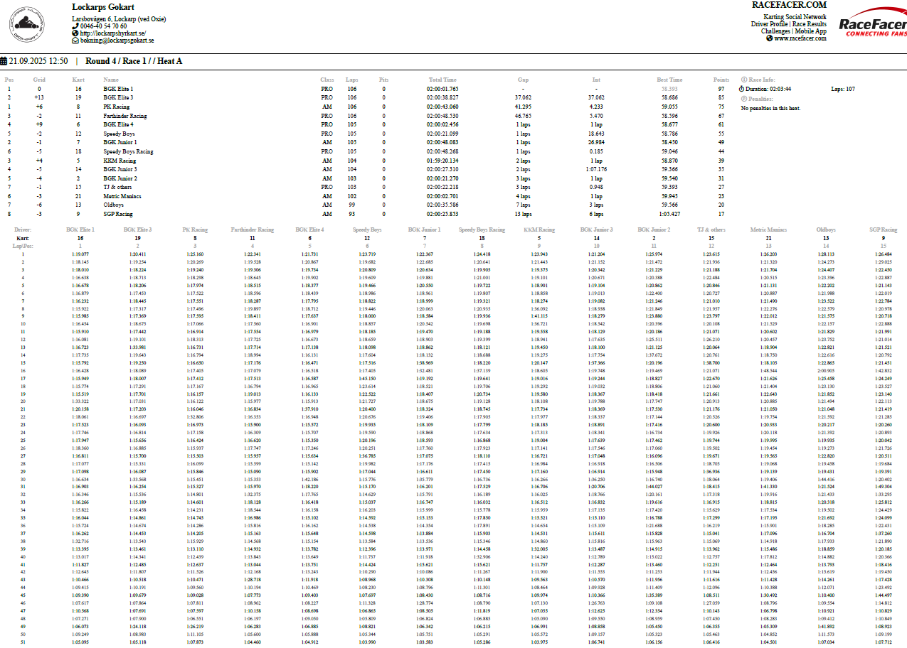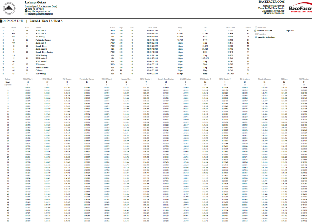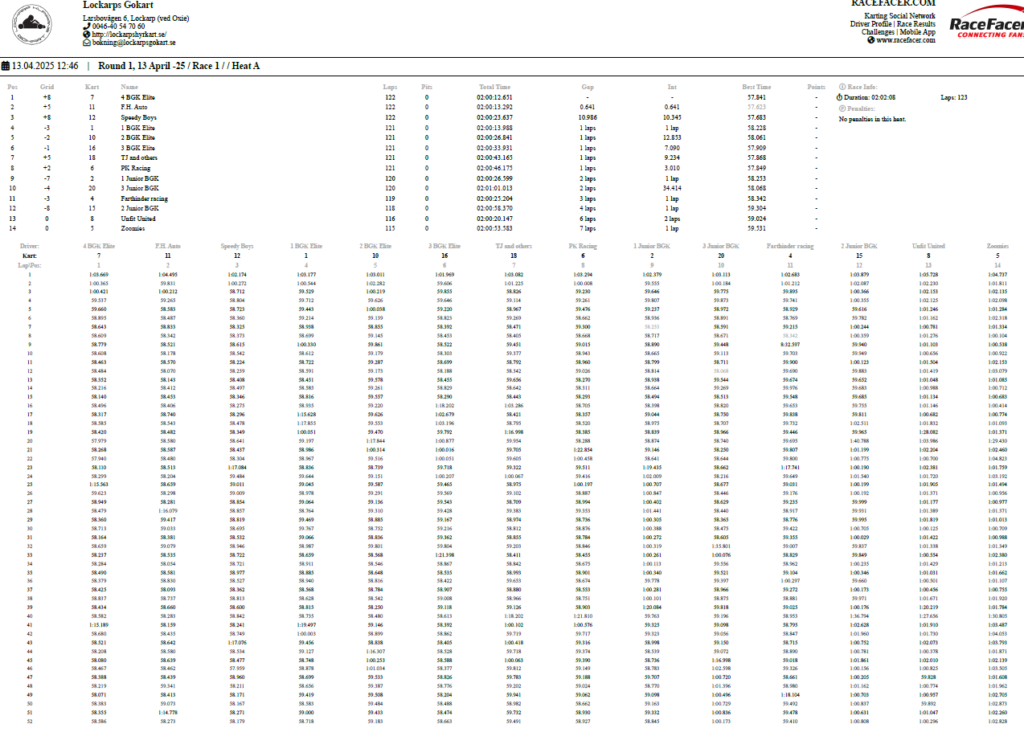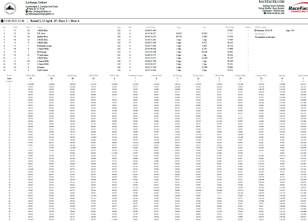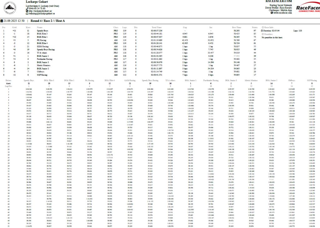Resultat Endurance Cup -25 Resultat efter fyra deltävlingar. Resultat Round 4, Klippan 21 Sep -25 PRO1 – BGK Elite 12 – BGK Elite 33 – Speedy Boys4 – BGK Elite 45 – Farthinder Racing6 – Speedy Boys Racing7 – TJ and others AM1 – PK Racing2 – BGK Junior 13 – KKM Racing4 – BGK Junior 35 – BGK Junior 26 – Metric Maniacs7 – Team Oldboys8 – Team SGP Race 7 Race 8 Resultat Round 3, Klippan 8, Juni -25 PRO1 – BGK Elite 12 – BGK Elite 33 – BGK Elite 44 – Farthinder Racing5 – BGK Masters6 – Zito 17 – Ek Motorsport8 – TJ and others AM1 – BGK Junior 12 – PK Racing3 – Zito 24 – BGK Junior 35 – BGK Junior 26 – Team Oldboys6 – Team SGP Race 5 Race 6 Resultat Round 2, Lockarp 18 Maj -25 PRO1 – Farthinder Racing2 – BGK Elite 13 – Speedy Racing4 – F.H Auto5 – Speedy Boys6 – BGK Elite 37 – Loozers8 – BGK Masters9 – TJ and others AM1 – BGK Junior 12 – PK Racing3 – KKM Racing4 – BGK Junior 35 – Team SGP6 – Team PR Tryck Race 3 Race 4 Resultat Round 1, Klippan 13 April -25 PRO1 – F.H Auto2 – BGk Elite 13 – BGk Elite 44 – Speedy Boys5 – BGk Elite 36 – BGk Elite 27 – Farthinder Racing8 – TJ and others AM1 – PK Racing2 – BGK Junior 13 – BGK Junior 34 – BGK Junior 25 – Unfit United6 – Zoomies Race 1 Race 2